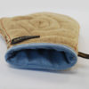 Manopla de tela hecho a mano en saco de arpillera con muy poco estampado que puede variar ligeramente.